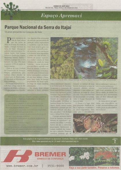 Esta matéria foi publicada no Jornal Diário doAlto Vale no dia 03 de junho de 2014. O Espaço Apremavié publicado quinzenalmente.