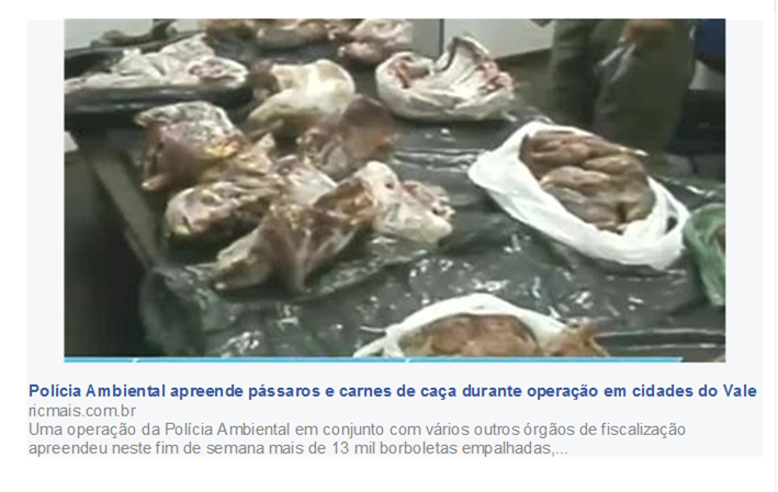 Polícia Ambiental apreende pássaros e carnes de caça Publicado em: 24/06/2014 às 16:31 Uma operação da Polícia Ambiental em conjunto com vários outros órgãos de fiscalização apreendeu neste fim de semana mais de 13 mil borboletas empalhadas, além de 32 aves e carnes de caça. Tudo isso em cidades como Apiúna e Blumenau. Batizada de Livro Vermelho, a ação de combate ao tráfico do patrimônio ambiental ocorreu também nas cidades de Gaspar, Indaial e Guabiruba. Polícia Ambiental apreende pássaros e carnes de caça durante operação em cidades do Vale RIC Mais 23/06/2014 - 13:39 - Meio Dia Blumenau |