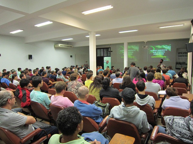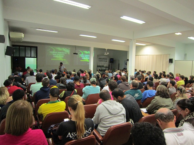 Conhecendo para a Sustentabilidade Publicado em: 25/06/2014 às 14:24 Na noite desta terça-feira (24/06/14) participaram de uma mesa redonda sobre "Conhecendo para a Sustentabilidade", promovida pelo EJA (Educação de Jovens e Adultos) do SESI, o Prof. Lauro Eduardo Bacca falando sobre 'O meio ambiente que poucos conhecem'; a Profa. Lucia Sevegnani ressaltando 'Sustentabilidade só com biodiversidade' ambos da Acaprena, juntamente com Elimar Russi da Vigilância Sanitária de Blumenau - falando sobre 'Posse responsável de Animais Domésticos'. Na oportunidade estiveram presentes 160 estudantes orientados pelas professoras Mabeli Espindola, Tatiana de Oliveira, Rochele e Sílvia. A atenção foi centrada nos palestrantes durante as 2 horas do evento. Consideramos que ações como estas proporcionam aos estudantes contato com pesquisadores e oportunidade de conhecer diferentes assuntos, fortalecer o aprendizado e facilitar a integração.